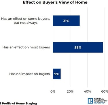 National Association of Realtors (NAR) cited 89% of staged homes have an effect on buyers. Similarly, nearly 85% of realtors agree that a staged home will sell faster than an unstaged home.